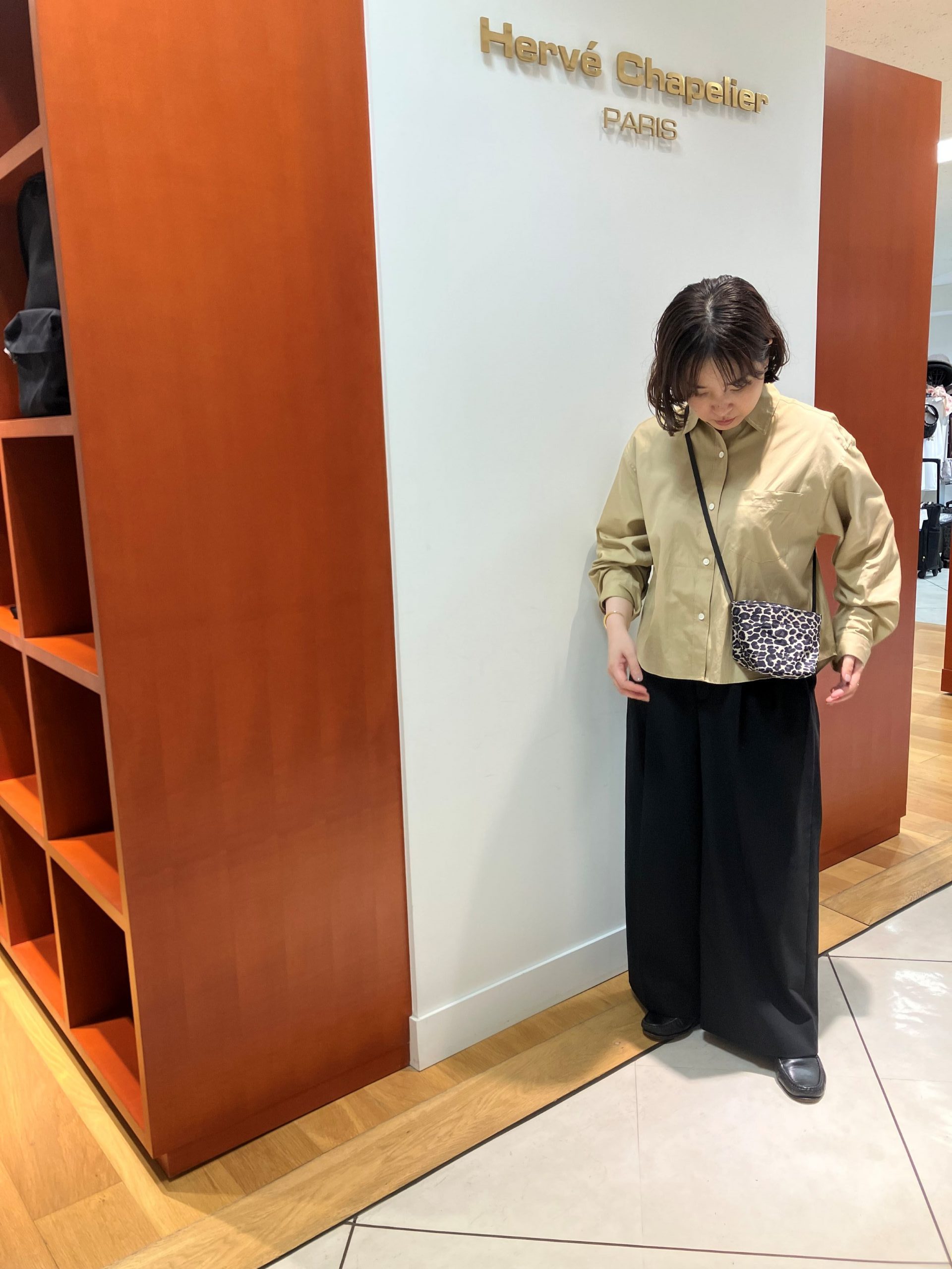 昨日の出勤コーデです。雨が降っていたので、パンツは黒にして