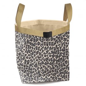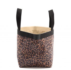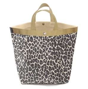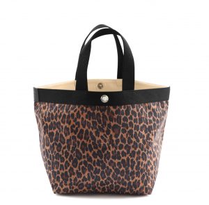 白地のヒョウ柄に、ゴールドハンドルで華やかに、タグは黒でシックに。