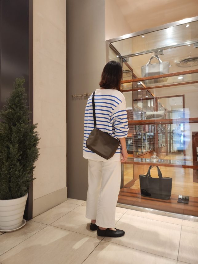 ストラップを短く結んでサコッシュ風に持つとアクティブスタイルに変身!!