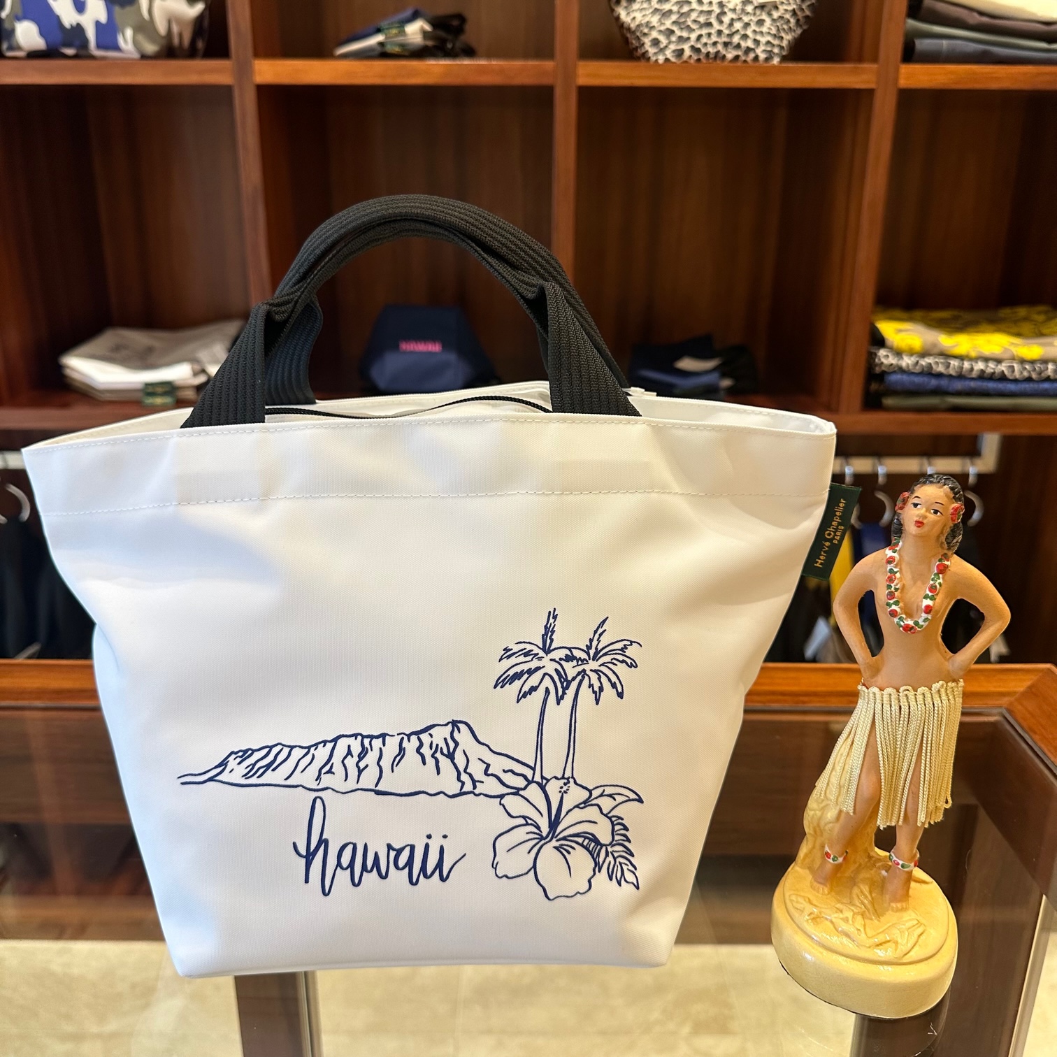 このダイヤモンドヘッド柄のトートバッグは、実は2代目なのです。初代にはヤシの木のプリントはなく、ハイビスカスの位置も異なる場所にあり、大変な人気を博して完売。現在は生産が終了しています。