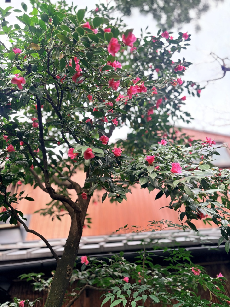 そうです。12月は紅葉でいっぱいだった中庭が、ピンクのかわいい椿に変わってました!!