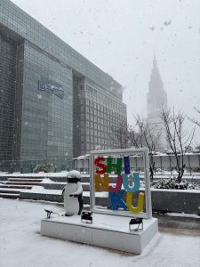 今朝は関東でも雪がつもり、新宿駅前も雪景色。ペンギンの上にも雪が積もっていました⛄️