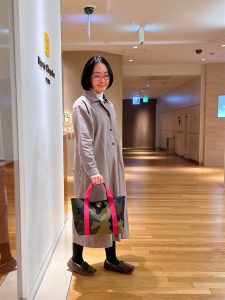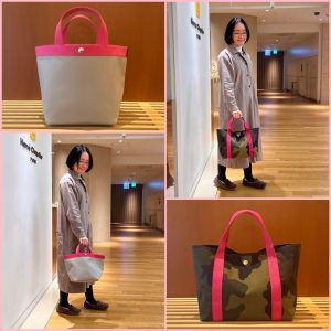 定番のカラーや柄のバッグでもフューシャピンクハンドルを持つと