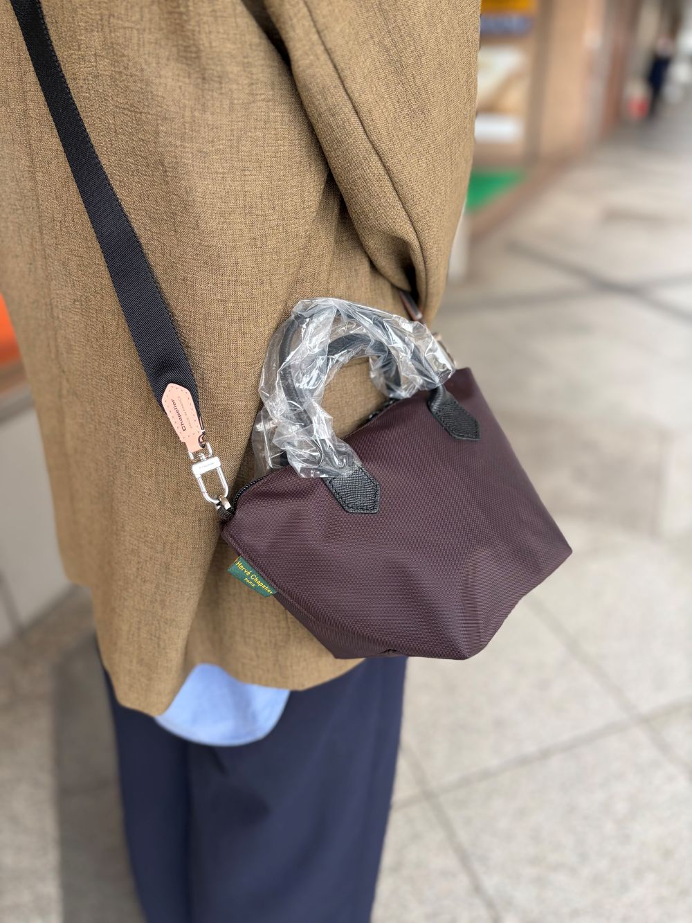 レザーハンドルのミニサイズバッグにショルダーが付けられる金具付き!
